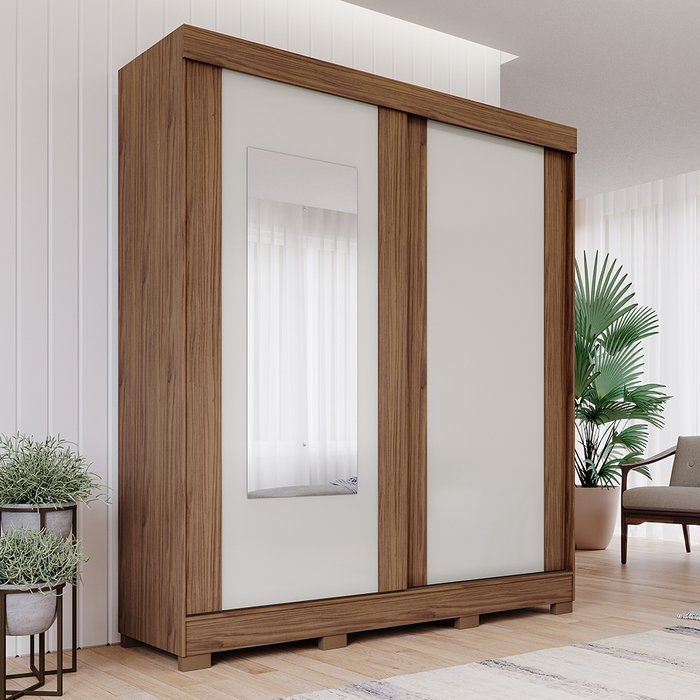 Guarda Roupa 100% MDF 2 Portas de Correr Flex Color Espelho 3 Gavetas e 8 Pés Bonito Espresso Móveis Avelã-Avelã/Off White