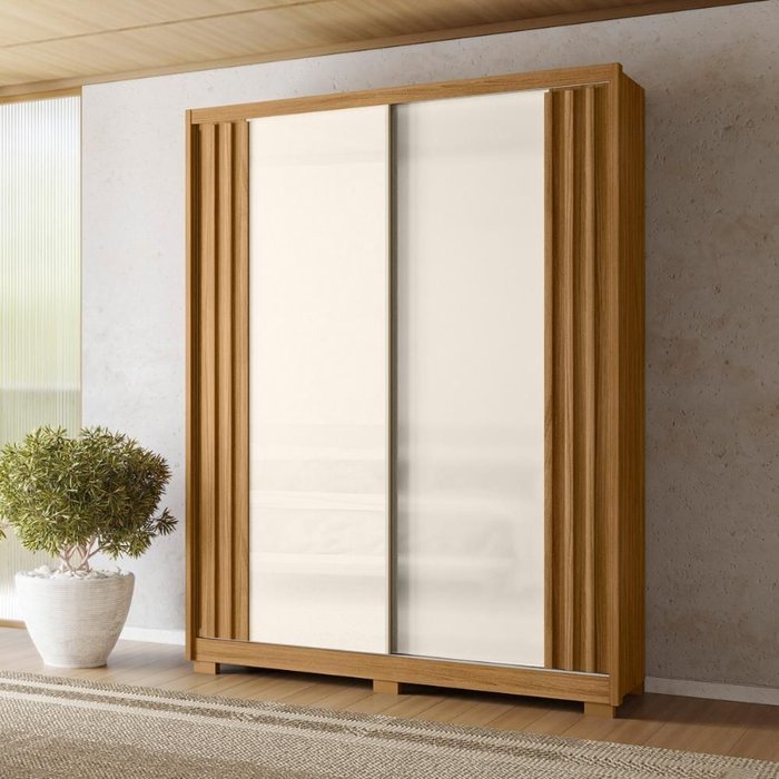 Guarda Roupa 2 Portas Ripadas Espelhada Wow Freijó Off White