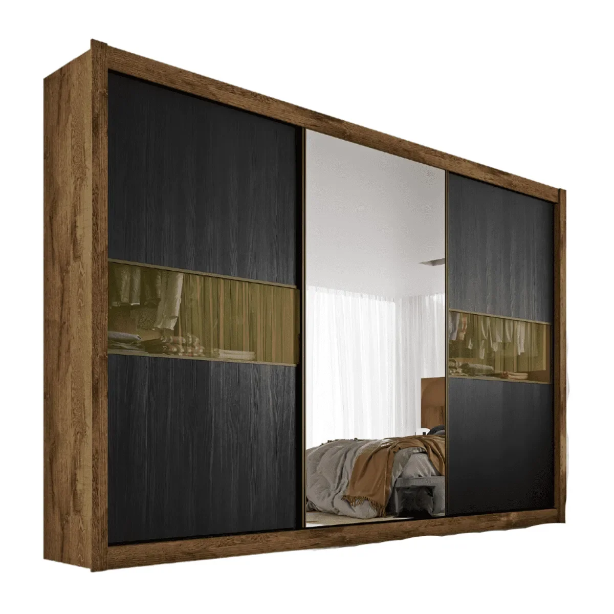 Guarda Roupa 3 Portas 6 Gavetas com Espelho Genebra Móveis Europa:Brauna Preto Absoluto Sepia
