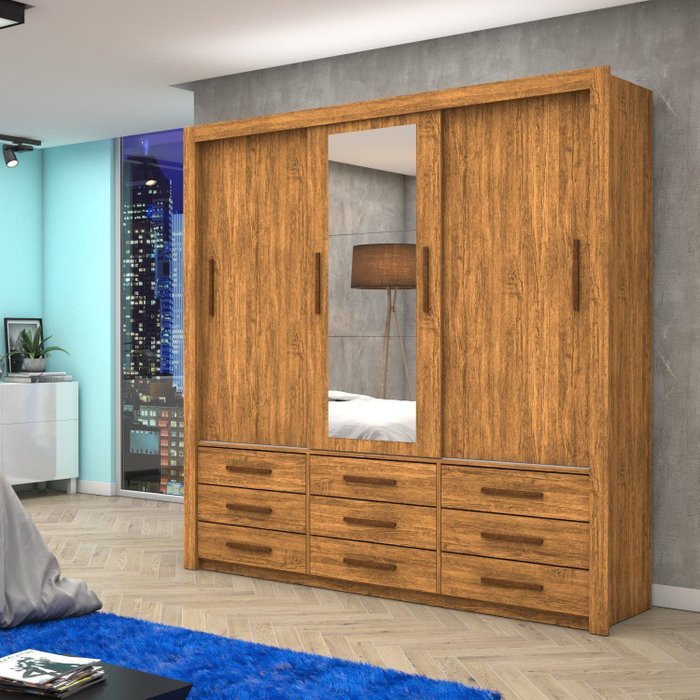 Guarda-roupa 3 Portas Correr com Espelho 9 Gavetas Anjos