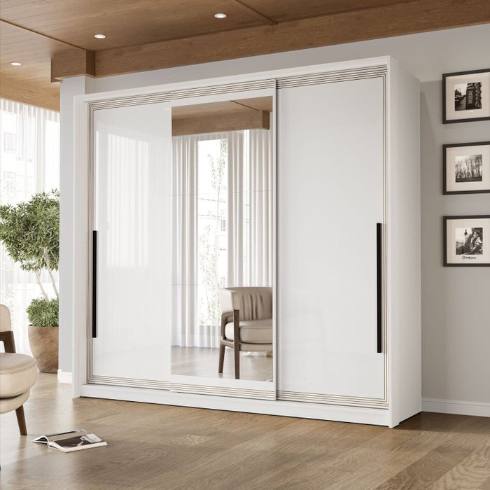 O guarda-roupa 3 portas 4 gavetas da linha Valência, da Politorno Móveis, é ideal para quem busca espaço, praticidade e sofisticação. Com 200 cm de altura, 220 cm de largura e 47,5 cm de profundidade, oferece ampla capacidade de organização para roupas, calçados e acessórios. As portas de abrir proporcionam fácil acesso, enquanto as 4 gavetas, com corrediças telescópicas, garantem deslizamento suave e preciso. Fabricado em MDP/MDF com acabamento em pintura UV e FF, é resistente e durável. O espelho embutido agrega sofisticação ao móvel, enquanto os puxadores externos e detalhes usinados completam o visual elegante, tornando-o perfeito para um quarto funcional e sofisticado.
