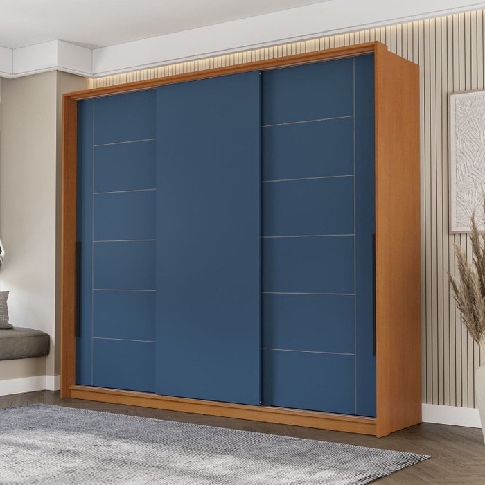 Guarda Roupa 3 Portas de Correr 4 Gavetas Lisboa Freijó/Azul