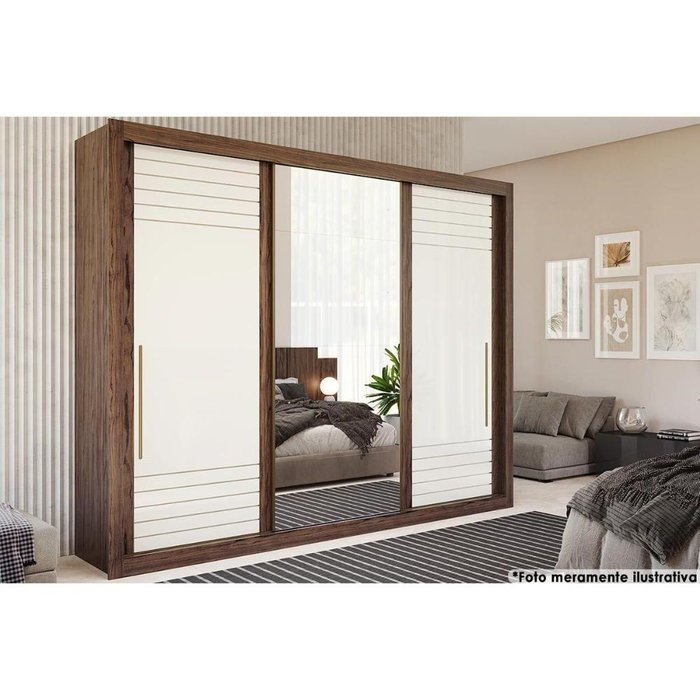 Guarda Roupa 3 Portas de Correr e 6 Gavetas C- Espelho Vitória Cacau-off White - Panan