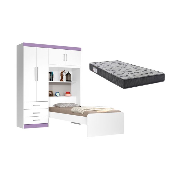Guarda Roupa 4 Portas Cama Solteiro Cancun Branco Lilás com Colchão - JA