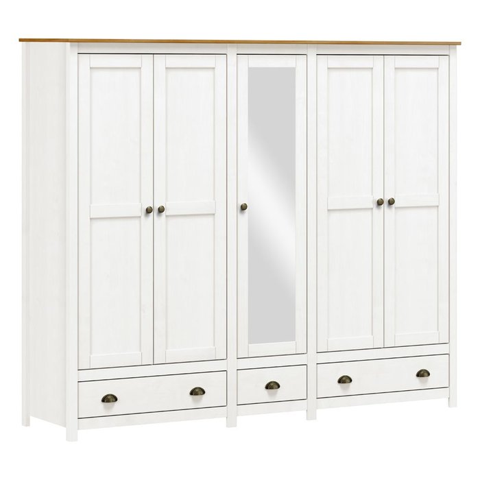 Roupeiro conta com 5 portas com estrutura 100% em madeira maciça de pinus reflorestada. Possui 3 gavetas e prateleiras, proporcionando espaço para tudo. Puxadores metálicos em ouro envelhecido;