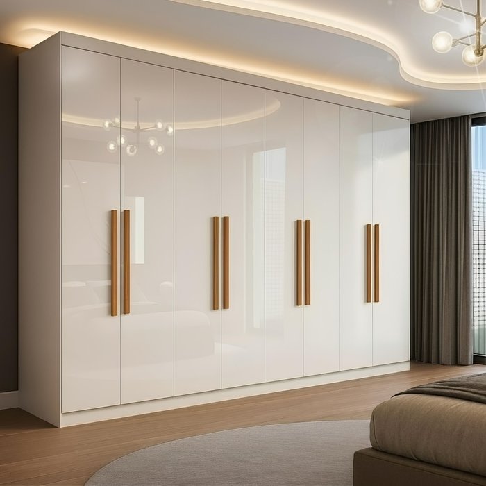 Com 8 portas de abrir e amplo espaço interno, o modelo oferece excelente organização com gavetas internas com corrediças metálicas, varão e calceiro em madeira. Sua modulação interna versátil permite acomodar desde roupas longas até acessórios, adaptando-se perfeitamente às suas necessidades.