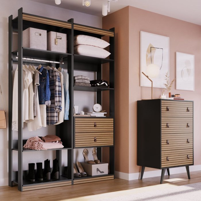 Guarda Roupa Aberto Closet 1 Cabideiro 2 Gavetas com Cômoda 4 Gavetas Wood Preto/Brise