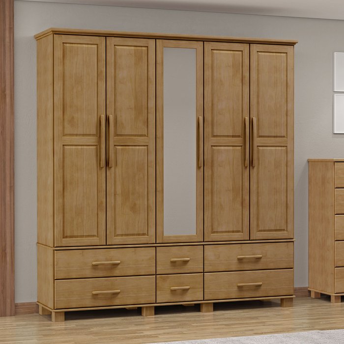 Guarda-Roupa Bipartido 5 Portas 6 Gavetas 100% Madeira Maciça Linha Ouro