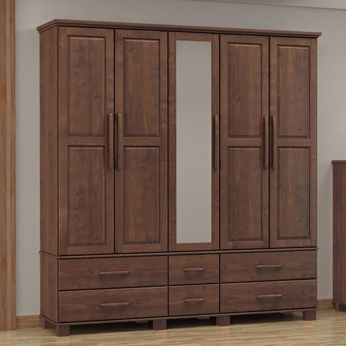 O Guarda Roupa Bipartido 5 Portas e 6 Gavetas da Linha Ouro é feito 100% de madeira maciça, o acabamento é em Verniz Acetinado PU e UV.