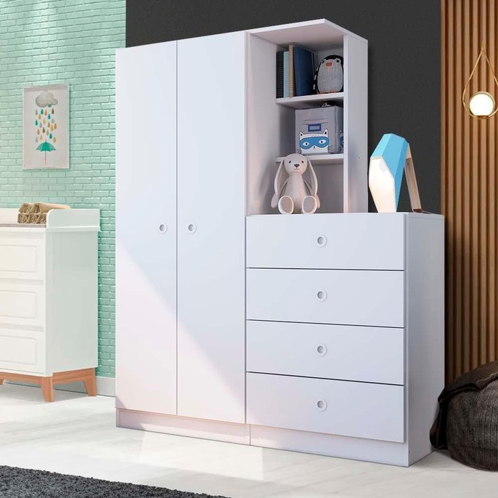 Guarda-roupa Branco com Estante Nichos 2 Portas 4 Gavetas Elijah Shop Jm