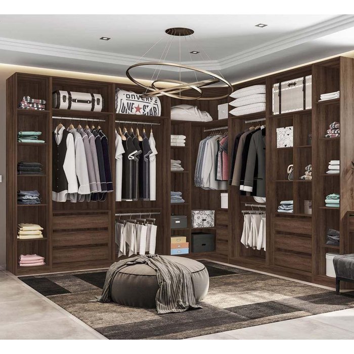 Guarda Roupa Canto Closet Sem Portas 6 Peças, 9 Gavetas, 6 Cabideiros Prime Luciane Móveis Nogueira Dourado