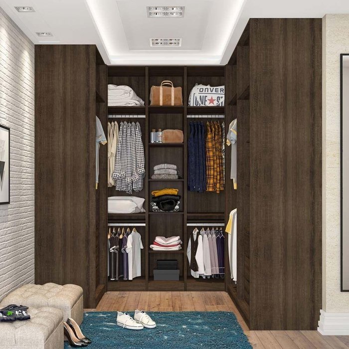 Guarda Roupa Closet Sem Portas Canto Em U Com 5 Peças, 6 Gavetas, 5 Cabideiros Prime Luciane Móveis Nogueira Dourado