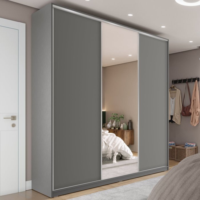 O Guarda-Roupa Zermatt é confeccionado em MDF de alta qualidade, com acabamento melamínico BP e fitas de borda em PVC, oferecendo excelente resistência e durabilidade. Este modelo conta com corrediças telescópicas de alto padrão, trilhos e puxadores em alumínio, além de um sistema anti-descarrilamento, proporcionando um deslizamento suave e seguro. Com um amplo espaço interno, é ideal para quem valoriza organização e qualidade. O guarda-roupa Zermatt possui um espelho inteiriço, que além de funcional, adiciona sofisticação ao ambiente. Um móvel elegante e prático, pensado para superar todas as suas expectativas!