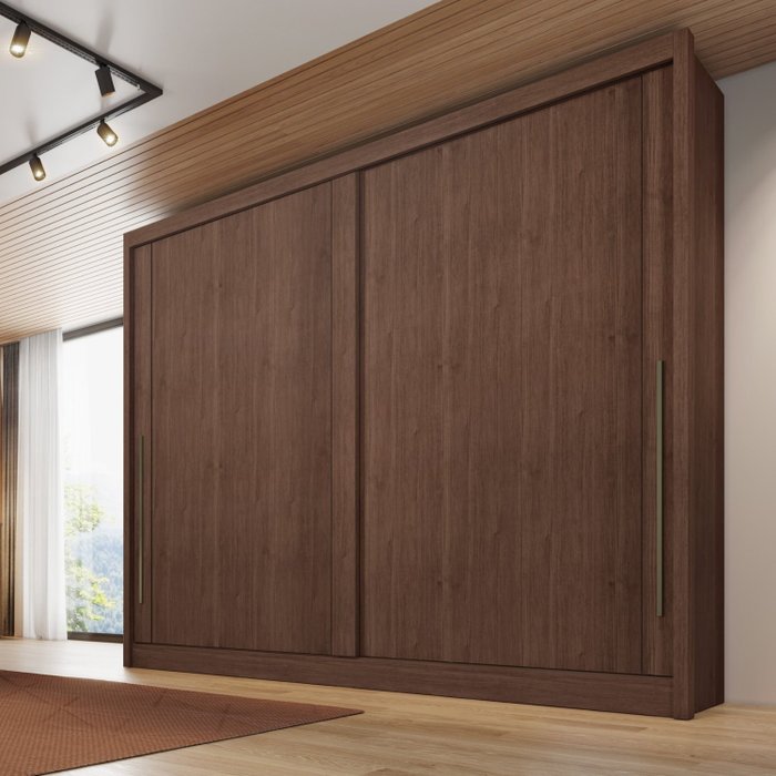 100% mdf, colunado em 25mm, portas encabeçadas em 25mm, trilho inferior em alúminio e roldanas com amortecedores, interno ele e ela, roldana superior com guia zero e freio, espaço para longo, gavetas com puxadores e corrediças telescopcas, cabideiro e calceiro em alumínio.