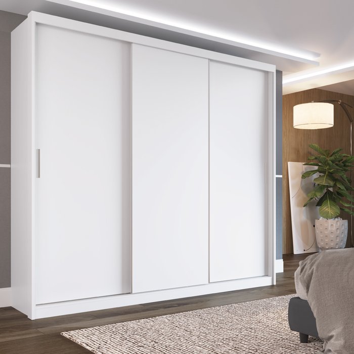 Guarda-Roupa casal com 3 portas de correr 100% MDF, ótimas disposições internas com aproveitamentos máximo de seu produtos, possuindo 02 cabideiros e um calceiro para melhor acomodas as roupas, 05 prateleiras para oferecer conforto e usabilidade, possui também um maleiro amplo.!