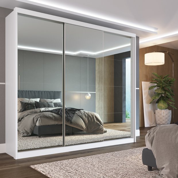 Guarda-Roupa casal com 3 portas de correr 100% MDF, sendo 3 Portas com espelhos recobrindo a porta inteira, ótimas disposições internas com aproveitamentos máximo de seu produtos, possuindo 02 cabideiros e um calceiro para melhor acomodas as roupas, 05 prateleiras para oferecer conforto e usabilidade, possui também um maleiro amplo.!