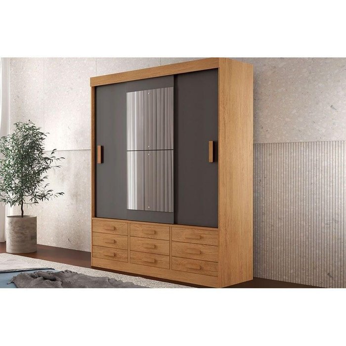 Guarda Roupa Casal 3 Portas de Correr (1 C- Espelho) e 9 Gavetas Detroit Naturale-grafite - Rufato