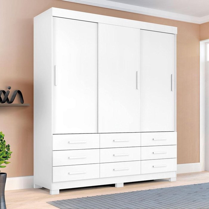 Dimensões do produto: Largura: 193 cm; Profundidade 52,8 cm; Altura 213 cm.Itens Inclusos: 1 guarda roupa- 3 portas de correr com trilhos em alumínio- Puxadores em MDF- 9 gavetas com corrediças metálicas que deslizam suavemente- Diversas repartições para melhor organização dos objetos- Possui 2 cabideiros- Produzido em MDP- Kit com 6 pés em PVC*O guarda roupa acompanha 6 pés em PVC, porém você pode optar por colocá-los ou não na hora da montagem do produto.Complexidade da montagem: Média, pode ser montado por apenas uma pessoa e/ou necessite de maior conhecimento para montagem.Recomendações de uso, manutenção e limpeza: Limpar com flanela ou pano macio seco, não utilizar produtos abrasivos, desengordurantes, álcool ou solvente. Não expor o produto diretamente a luz solar e à umidadeGarantia: 3 mesesOBS: Foto meramente ilustrativa, objetos e decoração não fazem parte do produto.