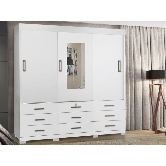 Guarda Roupa Casal 3 Portas de Correr com Espelho 9 Gavetas Itapema – Branco