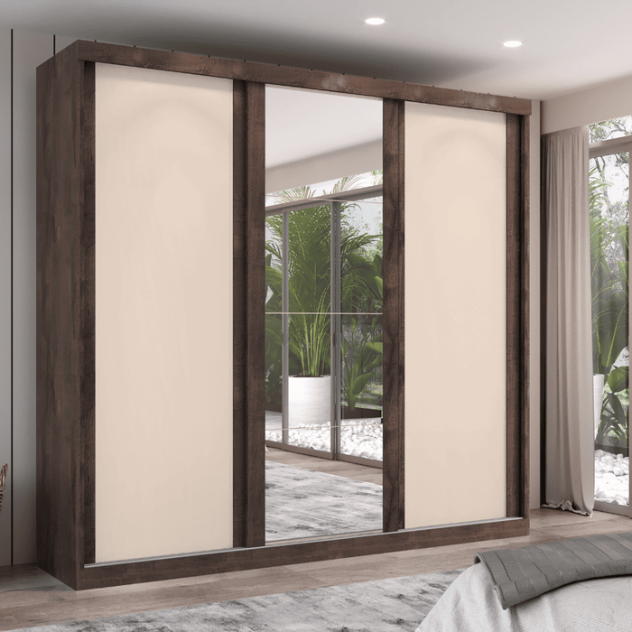 Guarda-roupa Casal 3 Portas de Correr com Espelho e 6 Gavetas Sevilha Chocolate/Offwhite