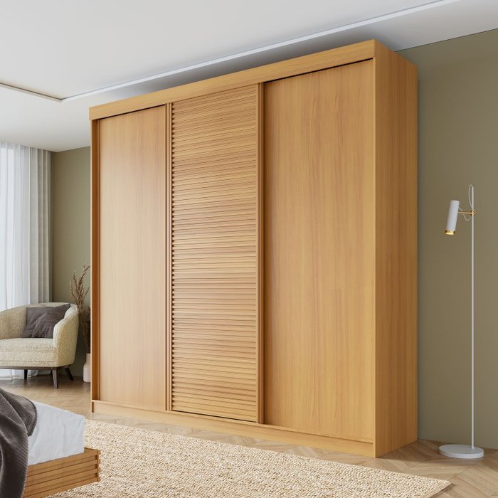 O grande diferencial fica por conta das três portas de correr, que economizam espaço no quarto e possuem um deslizamento suave. O design na cor Carvalho é realçado pela porta central com textura ripada, um detalhe que se tornou tendência na alta decoração e confere uma elegância discreta ao móvel.