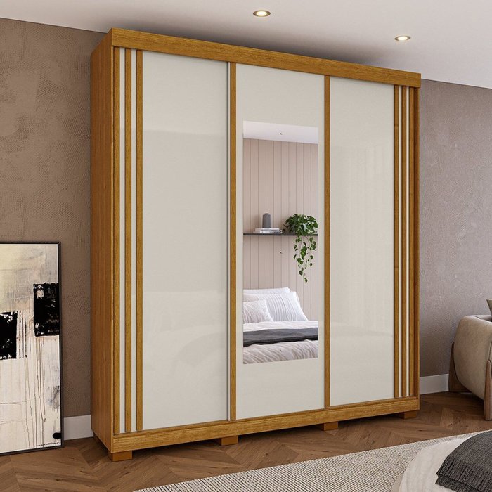 Guarda-roupa Casal 3 Portas Flex Color com Espelho 213cm 100% MDF Kamala Espresso Móveis Cinamomo/Off White/Cinamomo