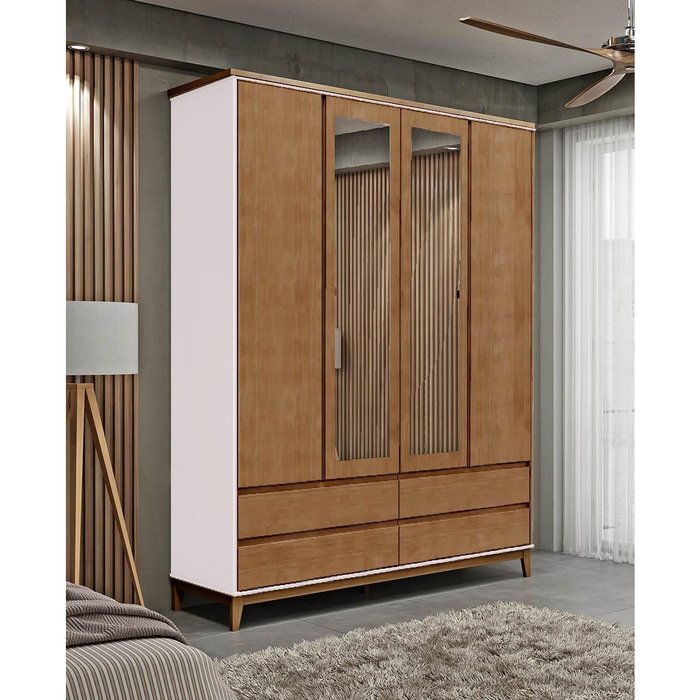Guarda-roupa Casal 4 Portas Espelhos 4 Gavetas Off White/freijó Prata Madeira Pinus com Mdf - Finest