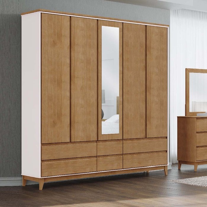 Guarda-roupa Casal 5 Portas Espelhos 6 Gavetas Off White/freijó Prata Madeira Pinus com Mdf - Finest