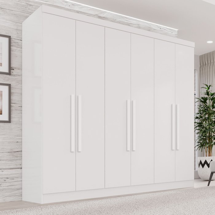 Projetado para oferecer excelente divisão interna, este guarda-roupa possui seis portas de bater que dão acesso a seis prateleiras espaçosas e cabideiros em alumínio, garantindo lugar para todas as suas peças. O destaque fica para as duas gavetas internas, que contam com corrediças telescópicas para uma abertura total e suave, ideal para organizar itens menores.