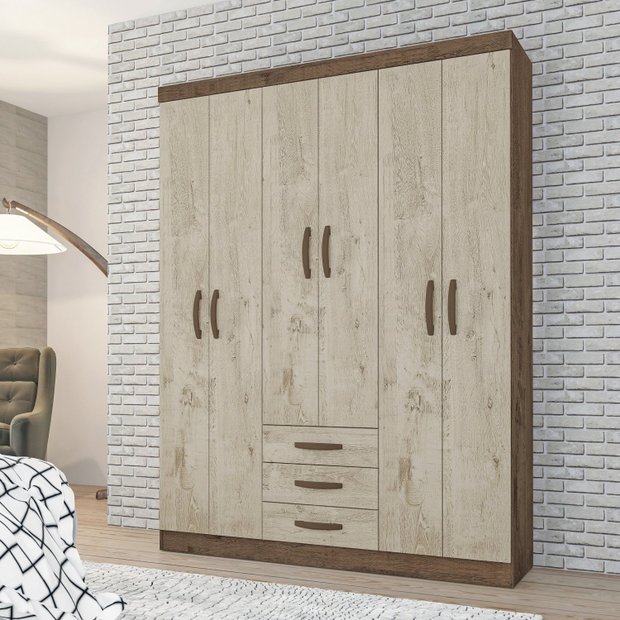 Guarda Roupa Casal 6 Portas 3 Gavetas Milano Mocaccino Rústico/Carvalho Rústico