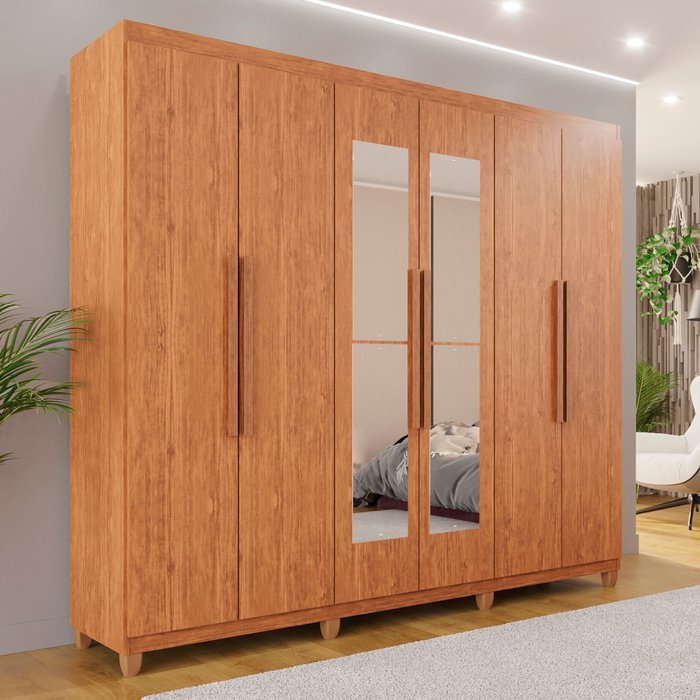 Procurando por um roupeiro espaçoso e elegante? Este roupeiro é ideal para você. Possui um visual clássico, com puxadores em madeira que conferem maior estabilidade e elegância. Conta com 4 gavetas com fundo reforçado para peças delicadas, cabideiros para peças pesadas e divisão ele/ela, facilitando a organização do casal. Estrutura em chapas de 15mm e dobradiças metálicas garantem portas firmes e fáceis de abrir, sem perder a regulagem. A pintura UV preserva a cor por mais tempo.