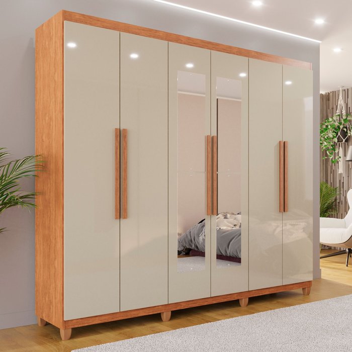 Procurando por um roupeiro espaçoso e elegante? Este roupeiro é ideal para você. Possui um visual clássico, com puxadores em madeira que conferem maior estabilidade e elegância. Conta com 4 gavetas com fundo reforçado para peças delicadas, cabideiros para peças pesadas e divisão ele/ela, facilitando a organização do casal. Estrutura em chapas de 15mm e dobradiças metálicas garantem portas firmes e fáceis de abrir, sem perder a regulagem. A pintura UV preserva a cor por mais tempo.