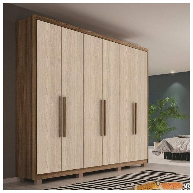 O Guarda-Roupas 6 portas Jundiaí é produzido em MDF e oferece um design moderno e sofisticado. Além de ser espaçoso; organiza melhor as suas roupas, sapatos e acessórios com praticidade. Possui uma divisão ele e ela e amplo espaço interno bem distribuído com ótima profundidade. Dispõe de 4 gavetas espaçosas com corrediças telescópicas. Cabideiros em alumínio embutidos na lateral e prateleiras internas. Puxadores no mesmo acabamento das portas e pés inclusos. Portas com borda soft minimizando as quinas. Acabamento em pintura UV texturizada em alto relevo com ótima definição de veios na impressão. Além de durabilidade e resistência possui um excelente custo-benefício. Perfeito para deixar seu quarto ainda mais funcional e aconchegante.