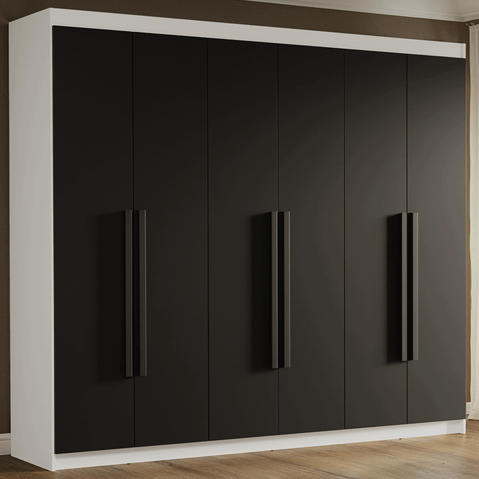 Possui uma pintura de alta resistência, que garante durabilidade e um acabamento impecável por muito mais tempo. A estrutura é na coloração Branca, as portas e os puxadores são na coloração preta, criando um visual sofisticado que se adapta a qualquer estilo de decoração. Os puxadores de 80 cm, fabricados em MDF, são um dos grandes diferenciais, trazendo um design alongado e moderno.