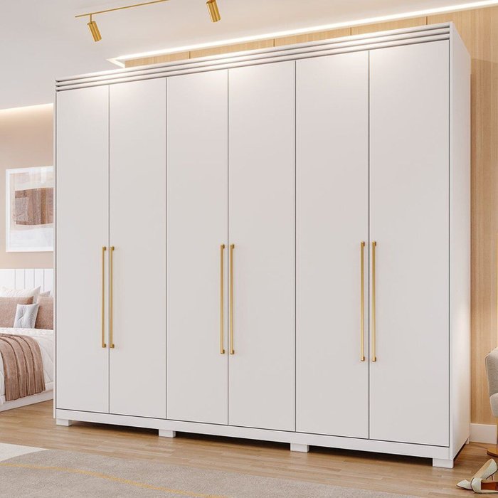 Guarda Roupa 100% MDF, espaçoso, com divisórias internas pensadas para uma perfeita organização. As portas com grandes puxadores em alumínio na cor dourada, tornam o ambiente elegante e dá um toque sofisticado e charmoso. Espelho interno que proporciona reflexo de corpo inteiro. Os acessórios são de qualidade superior, suas 6 gavetas internas contam com corrediças metálicas telescópicas para deslize suave e puxadores em ABS. Os Cabideiros são em alumínio com suportes metálicos.