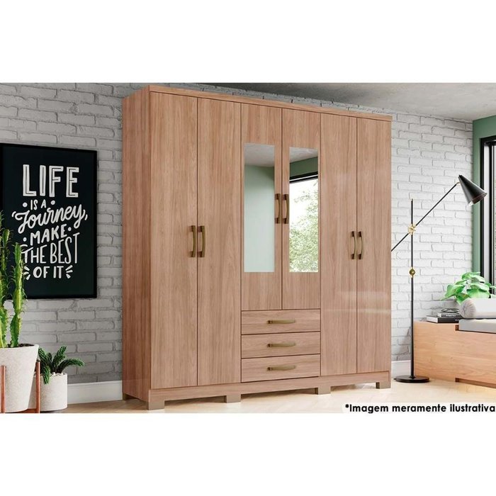 Guarda Roupa Casal 6 Portas e 3 Gavetas c/ Espelho e Pés Caju DA136 Jequitibá Brilho - Henn