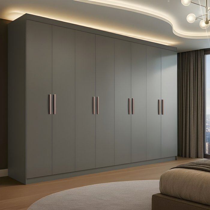 Com 237 cm de largura, este armário oferece uma organização interna excepcional. Ele conta com 8 portas de bater que revelam 10 prateleiras espaçosas, ideais para guardar roupas dobradas, caixas, sapatos e itens de cama.