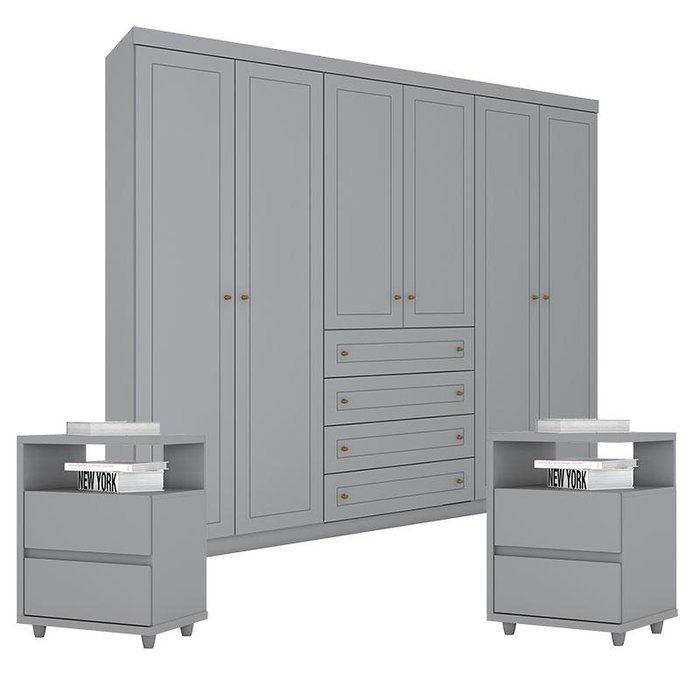 Guarda Roupa Casal Americano com Kit Mesa de Cabeceira Cinza - Henn