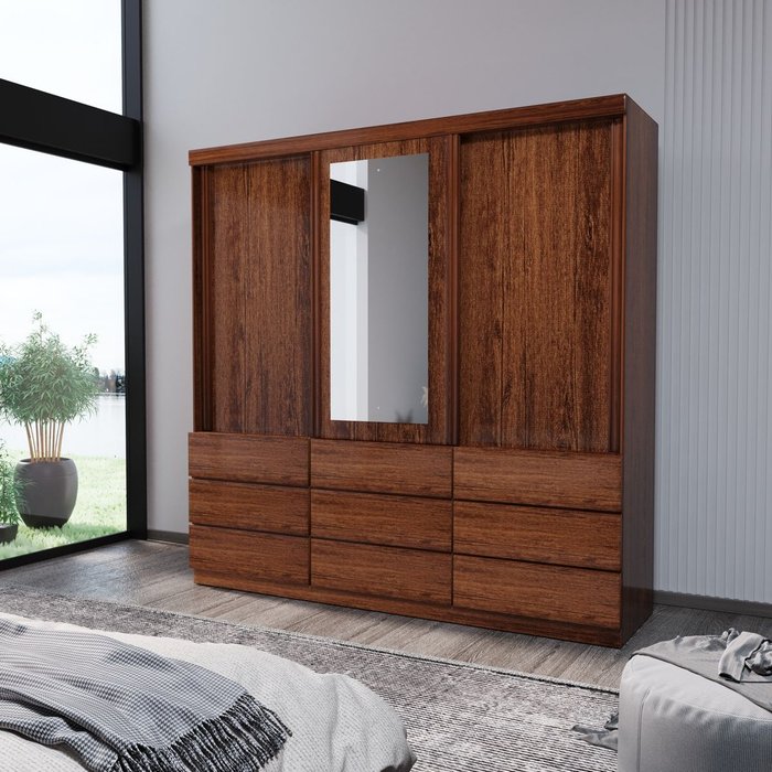 Guarda-Roupa Solteiro ECO 07 Com Espelho 100% MDF 3 Portas 9 Gavetas Bom Pastor