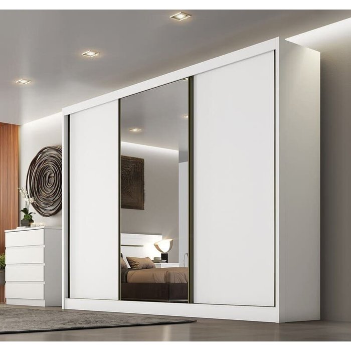 Guarda Roupa Casal com Espelho 3 Portas 6 Gavetas - Logan-Branco - Móveis Novo HorizonteO Guarda Roupa Casal com Espelho Logan veio para agradar todos os gostos. Procurando elegância, modernidade e sofisticação para seu quarto? Este é o produto que irá te oferecer essas qualidades. Produto fabricado em MDF com 3 portas de correr, sendo a central com espelho, possui um excelente espaço interno bem distribuído, oferecendo máxima organização de forma prática. Suas gavetas possuem corrediças telescópicas que traz uma maior sofisticação para o guarda-roupa e também proporciona um mecanismo silencioso para abrir e fechar as gavetas. Garanta já o seu!Faz parte do anúncio:Guarda Roupa Casal com Espelho 3 Portas 6 Gavetas - LoganObs. Objetos de decoração não inclusosParticularidades do guarda-roupa:Características:-As bordas do produto acompanham a cor externa -100% MDF -Espelho com película de segurança-Colunado em 25mm-Interno ele e ela-Trilho inferior em alumínio e roldanas com amortecedores-Perfil puxador e batente alinhador em alumínio bronze-Roldana superior com rolamento e freio-Espaço para longo-Gavetas internas com puxadores-Corrediças telescópicas-Cabideiros e calceiros em alumínio-6 Gavetas Dimensões:Altura: 2,36 metrosLargura: 2,73 metrosProfundidade: 55,5 centímetrosInformações Importantes:.-Produtos podem apresentar diferenças de tonalidades entre a foto na tela e o produto real, devido a calibração de cor de tela.-Limpar com flanela ou pano macio. Não utilizar álcool. Não utilizar produtos abrasivos ou corrosivos.-Nós prezamos pela qualidade da entrega em primeiro lugar, trabalhamos com transportadoras altamente selecionadas e os melhores materiais de embalagem.-A montagem é de total responsabilidade do comprador. Antes de comprar, verifique o espaço disponível para a montagem.-Certifique-se de que o produto caiba em elevadores e vãos de escadas, não fazemos içamentos. Quaisquer despesas deste tipo ficam a cargo do cliente-Garantia de 3 meses contra defeitos de fabricação.
