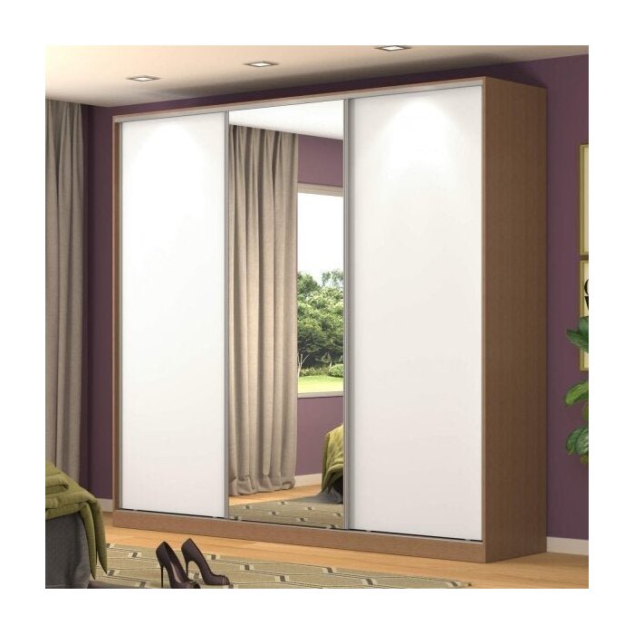 Guarda-Roupa Casal com Espelho 3 Portas de Correr Ocre/Branco