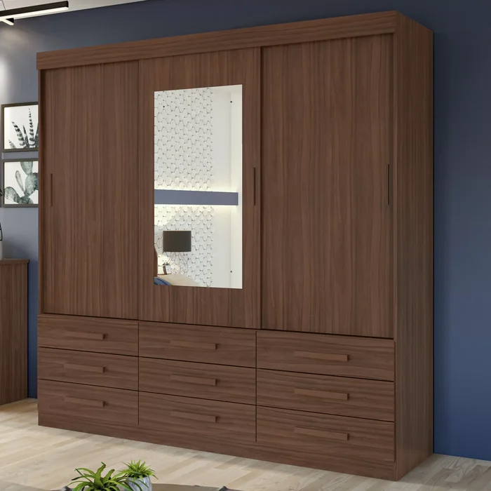 Guarda-Roupa Casal com Espelho 3 Portas de Correr 9 Gavetas Hércules Imbuia Naturale