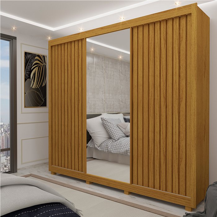 Guarda Roupa Casal com Espelho 3 Portas Pés Royale Ripado 100% MDF Naturale