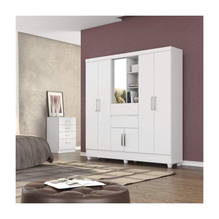 Guarda-Roupa Casal com Espelho 7 Portas 2 Gavetas Demóbile Branco/Rosa/Branco