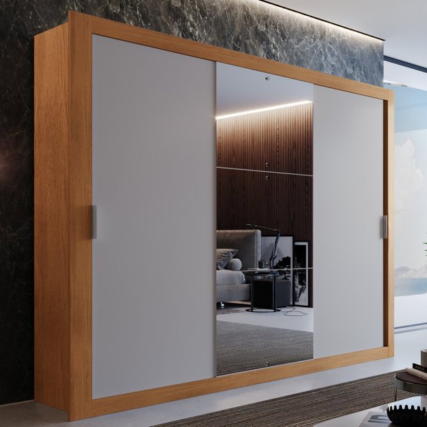 O guarda roupa conta com uma porta central totalmente espelhada, que proporciona um design moderno e aumenta a sensação de amplitude do seu ambiente. Além disso possui 3 cabideiros em plástico, 4 gavetas, 2 maleiros e 4 prateleiras para dispor de forma organizada e otimizada todas as peças.