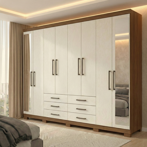 - Design Moderno e Versátil: A combinação de cores e os puxadores em ABS conferem um visual contemporâneo ao ambiente. As duas portas com espelhos retangulares não só auxiliam na hora de se vestir, mas também ampliam a sensação de espaço no quarto.