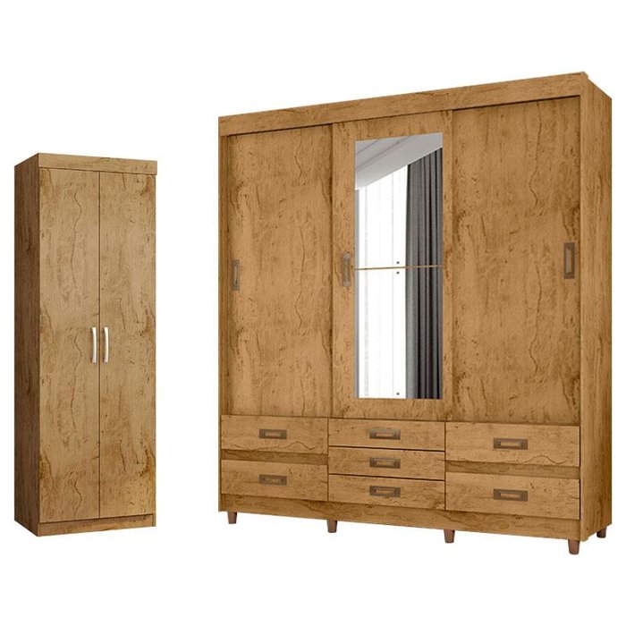 Começou a montar seu quarto? Então apresentamos para você este belo conjunto composto pelo guarda roupa da linha 37020 e o armário multiuso da linha 6020. O guarda roupa conta com três portas de correr, sendo a porta central com espelho e com sete gavetas equipadas com corrediças metálicas. Complementando o conjunto, o armário conta com duas portas e quatro prateleiras. Fabricados pela Araplac, são desenvolvidos em 100% MDP de qualidade. Foi projetado cuidadosamente para oferecer um ótimo espaço e organização. Se você estava procurando móveis com design moderno e um amplo espaço interno então será perfeito para compor o quarto do casal. Confira e aproveite!