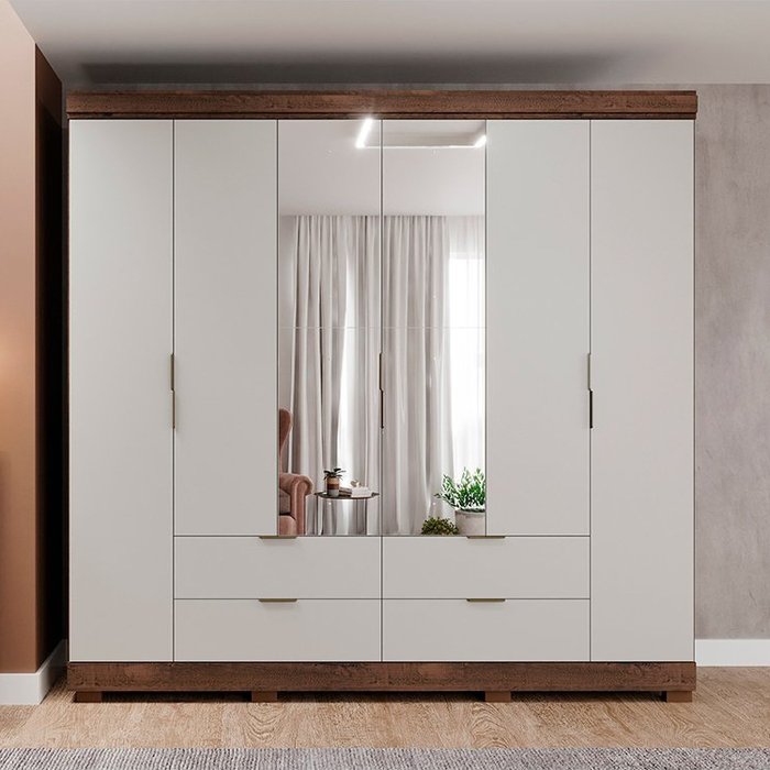 Guarda Roupa Casal em MDFcom Espelho 6 Portas 4 Gavetas e Pés Niterói Panan Móveis Café/Pérola