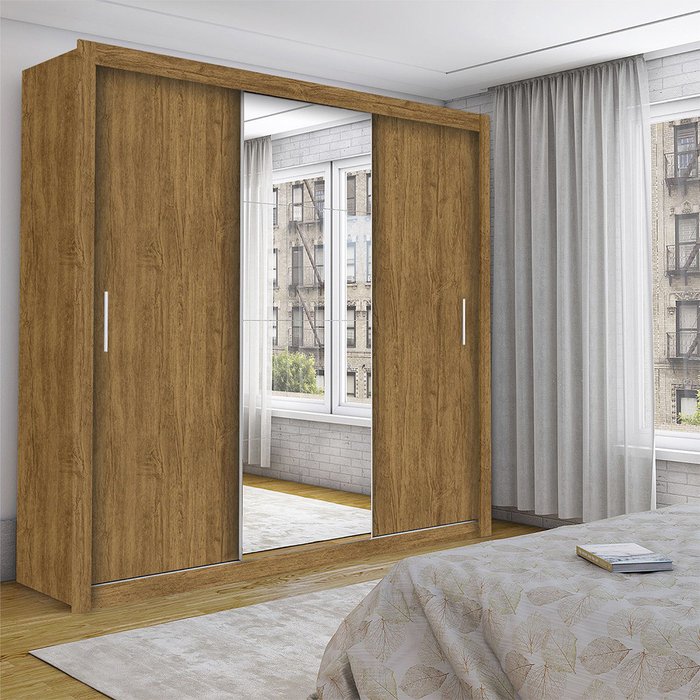 Guarda Roupa 3 portas de correr com Espelho Isabela Luxo Freijó com 1,85 de largura 2,08 de altura e 0,46 de profundidade. Acompanha 4 espelhos na porta do meio, que além de serem funcionais, trazem a sensação de amplitude, principalmente em ambientes menores. Sua cor freijó combina facilmente com todos os estilos de decorações, além de deixar o seu quarto com um visual sofisticado. Ideal para cabides de até 37cm, ele possui em seu interior 4 gavetas e 4 prateleiras para guardar suas roupas de cama, banho e o que mais for preciso, com a elegância e qualidade.