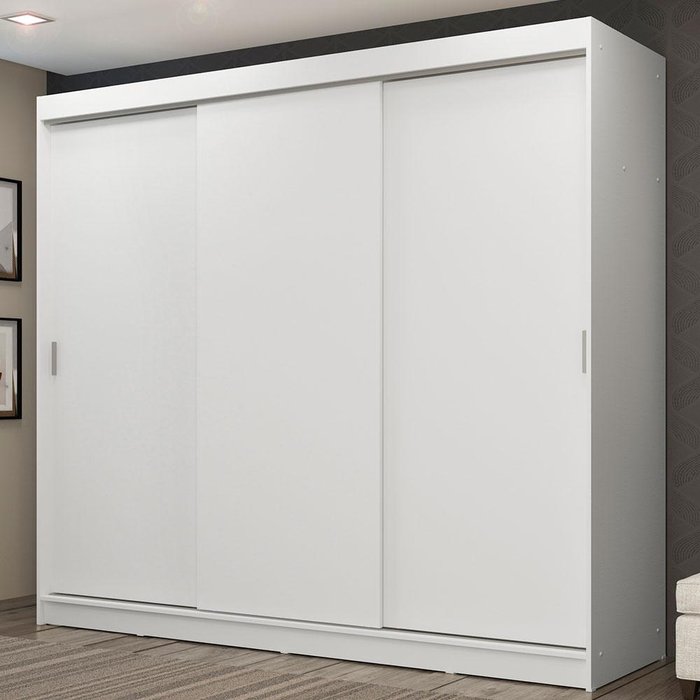O Guarda-Roupa Kansas da Madesa possui três portas de correr com deslizamento suave, trilhos em alumínio para maior resistência e dois puxadores externos.